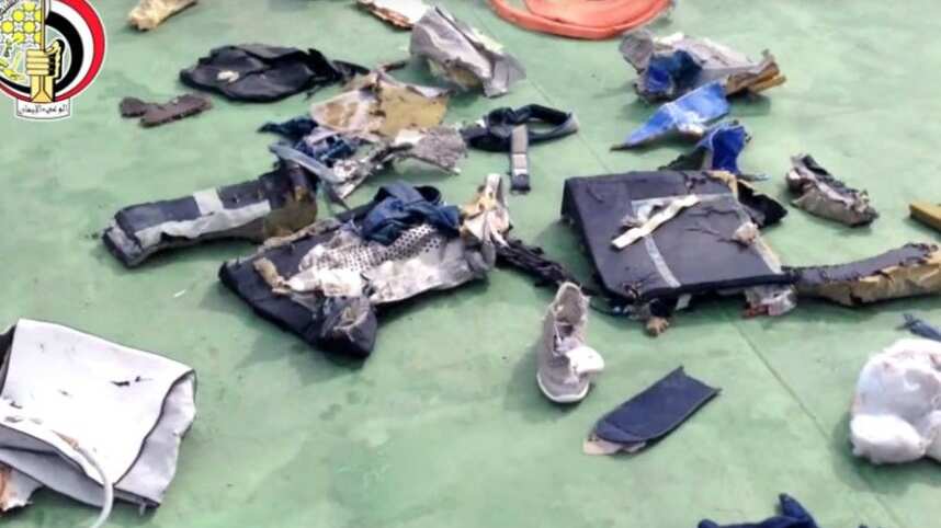 Fragmentos del avión con la marca de la aerolínea egipcia, partes de asientos y objetos personales de los pasajeros son algunos de los restos recuperados entre ayer y hoy por las fuerzas navales egipcias.