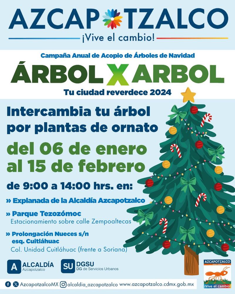 Tres centros de acopio funcionarán del 6 de enero al 15 de febrero, de 9:00 a 14:00 horas. Al llevar tu árbol de Navidad natural, te lo cambiarán por una planta de ornato en los siguientes puntos:
