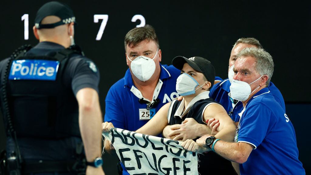 Se jugaba el final del segundo set donde Medvedev controlaba el juego cuando una mujer saltó a la cancha tras burlar el cordón de seguridad para mostrar una manta con la leyenda “abolid la detención de refugiados”.