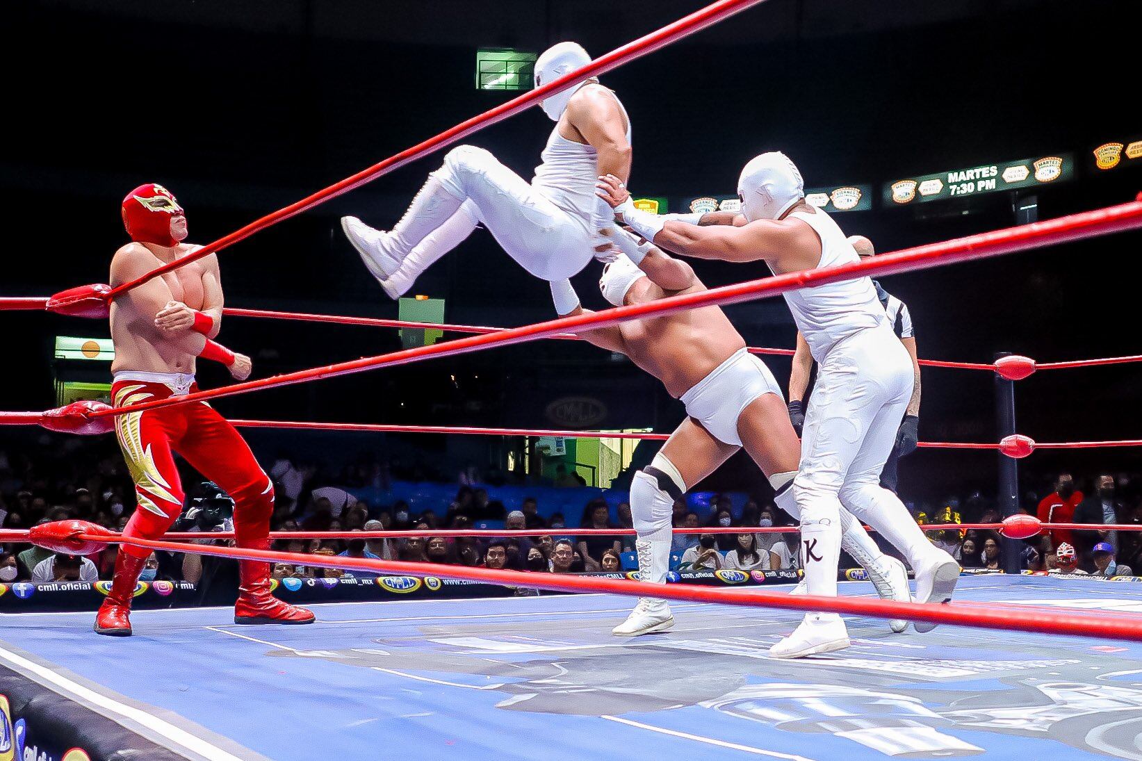 Durante la lucha de este domingo del CMLL, que se llevó a cabo en la Arena México, Eléctrico se lastimó el cuello y la cabeza al intentar un movimiento sobre Dr. Karonte I.