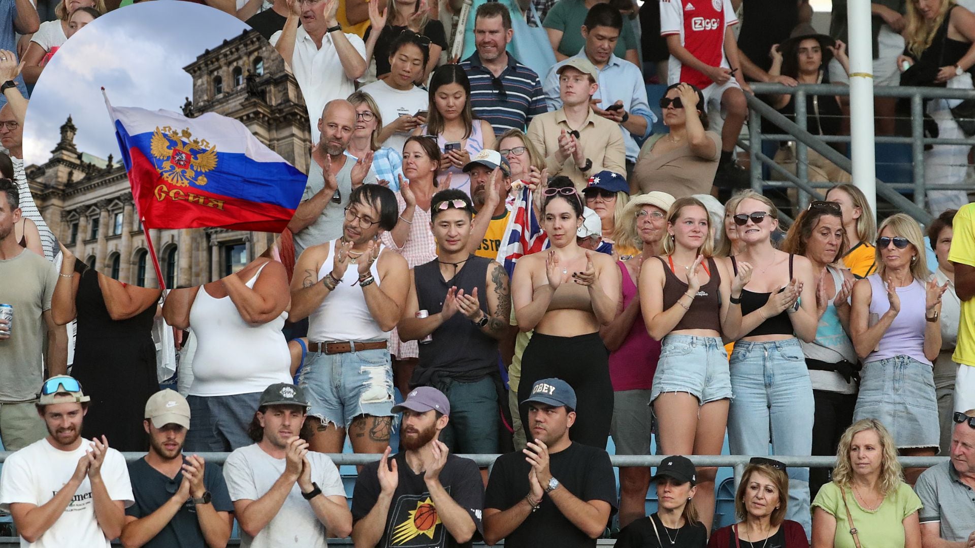 Una bandera rusa fue desplegada durante la victoria de la ucraniana Kateryna Baindl ante la rusa Kamilla Rakhimova en la cancha 14 durante la primera ronda. Le ofrecieron otra al ruso Daniil Medvedev para que la autografiara .