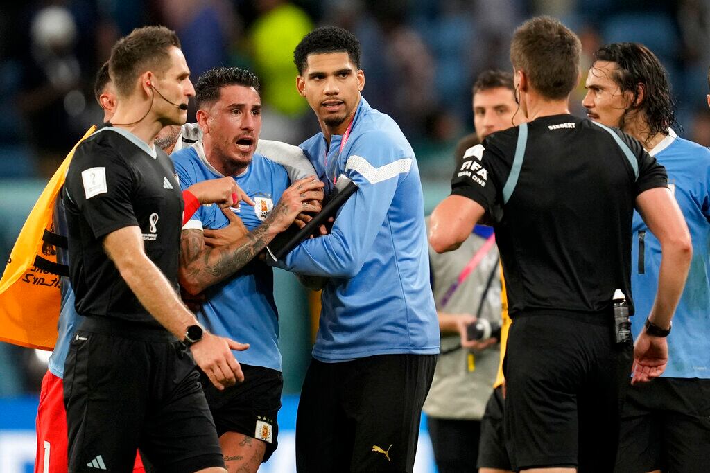 Los jugadores de Uruguay confrontaron al árbitro alemán Daniel Siebert antes del silbatazo final en el Estadio Al Janoub.