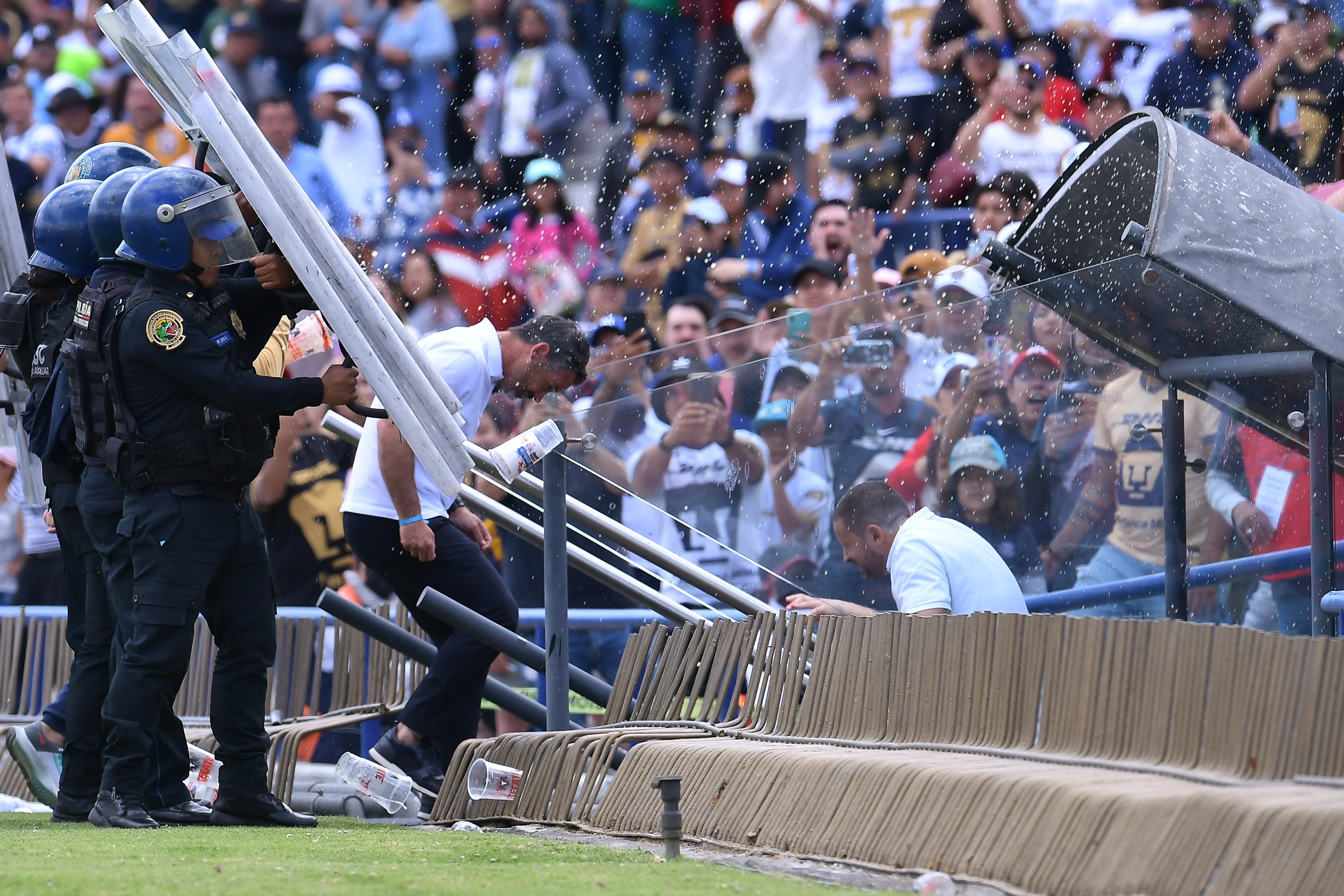 Con gritos de “Renuncia”, y “Vete”, los asistentes al estadio Olímpico Universitario arremetieron contra Rafa Puente e incluso, al salir a los vestidores, recibió una lluvia de cerveza, y botellazos, por lo que la policía tuvo que interceder para intentar resguardar la integridad del entrenador.