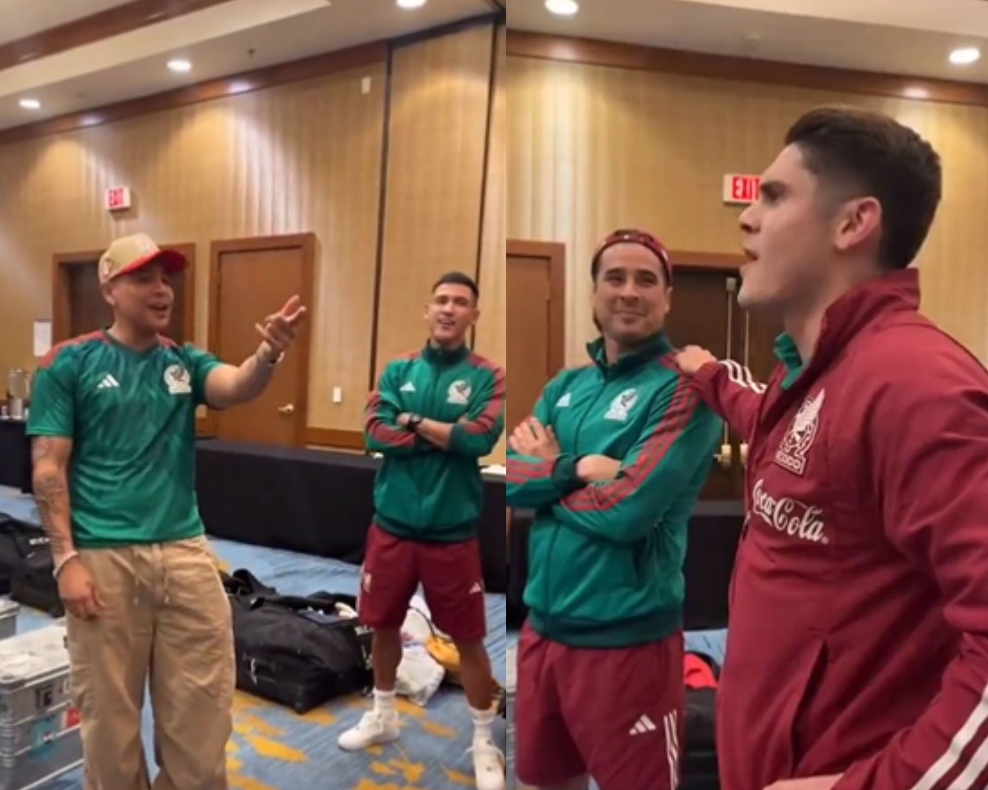 Aprovechando la visita de Eduin Caz, vocalista de Grupo Firme en la concentración de la Selección Mexicana en Las Vegas, Israel Reyes no dejó ir la oportunidad para lucir sus dotes como cantante al cantar a la par la canción de “Calidad”.
