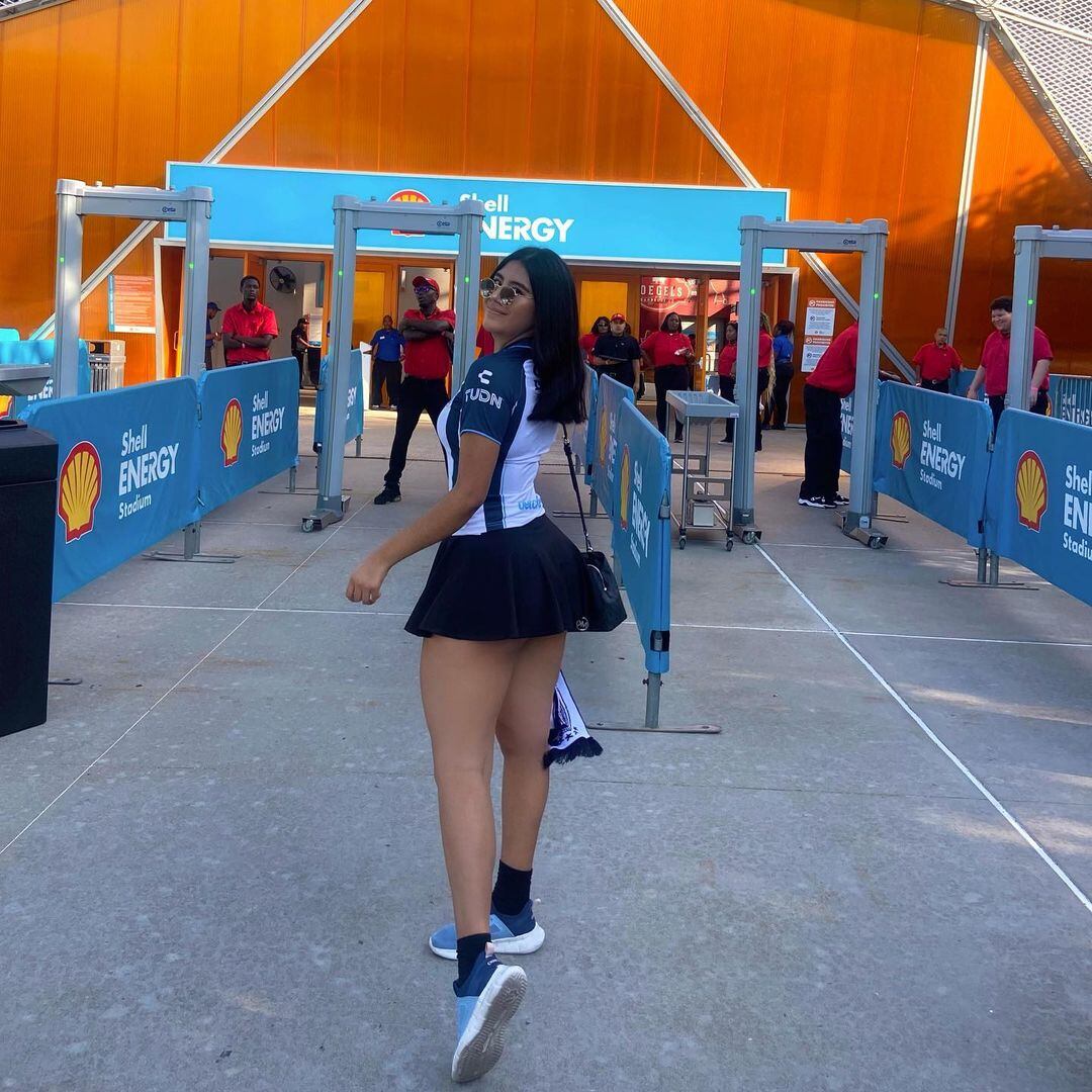 La futura doctora en medicina acudió al Shell Energy Stadium de Houston, Texas, donde se dejó ver con su tradicional jersey de los Tuzos, pero sorprendió al portar una minifalda negra con la que lució su torneada figura.