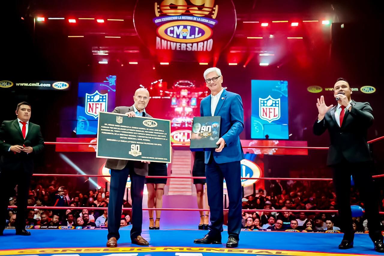 “NFL México rinde homenaje al Consejo Mundial de Lucha Libre (CMLL), fundado por Don Salvador Lutteroth González, por haber traspasado las barreras del tiempo y conduciendo este deporte espectáculo a ser parte fundamental de la identidad nacional y convertirlo en un referente de la cultura mexicana a nivel mundial. Deseamos a la familia Lutteroth muchas felicidades por este 90 Aniversario”, se lee en la placa entregada al Director General del CMLL, Salvador Lutteroth.