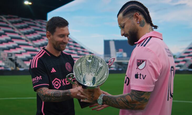 En el video se puede apreciar al cantante colombiano, entrar al DRV PNKStadium, casa del Inter de Miami, donde Messi le entrega un trofeo en el centro del campo.