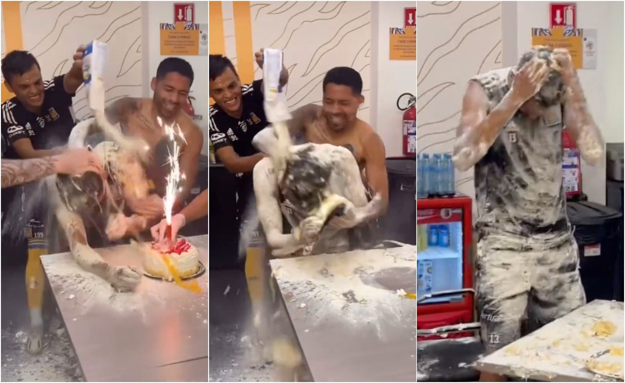 En el video que circula por las redes sociales, se puede observar como sus compañeros se reúnen a su alrededor para estrellarle huevos, tirarle harina y estrellar su cara con el pastel. Es importante mencionar que estas acciones son siempre en tono de broma, ya que en los equipos es muy común ver celebraciones de este tipo.