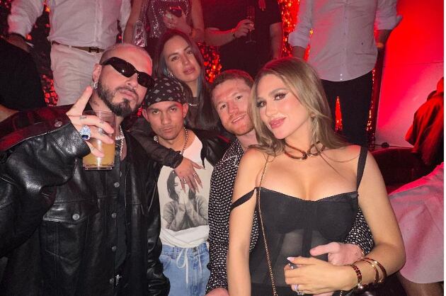 En primera instancia, posteó una foto en donde aparece el cantante J Balvin, además del productor Tainy y Yasi Ayala, mientras Canelo porta una camisa negra con puntos blancos.