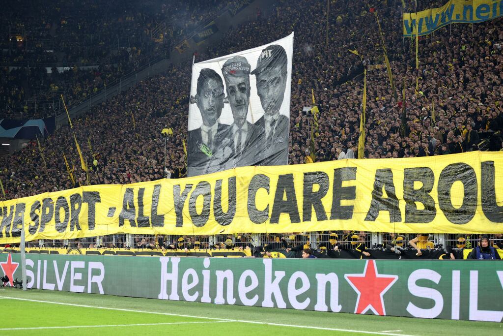 Fue al inicio del segundo tiempo cuando simpatizantes del club alemán lanzaron al campo del Signal Iduna Park billetes falsos, bolsas con el signo de precio y réplicas de lingotes de oro para protestar contra la UEFA y la FIFA.