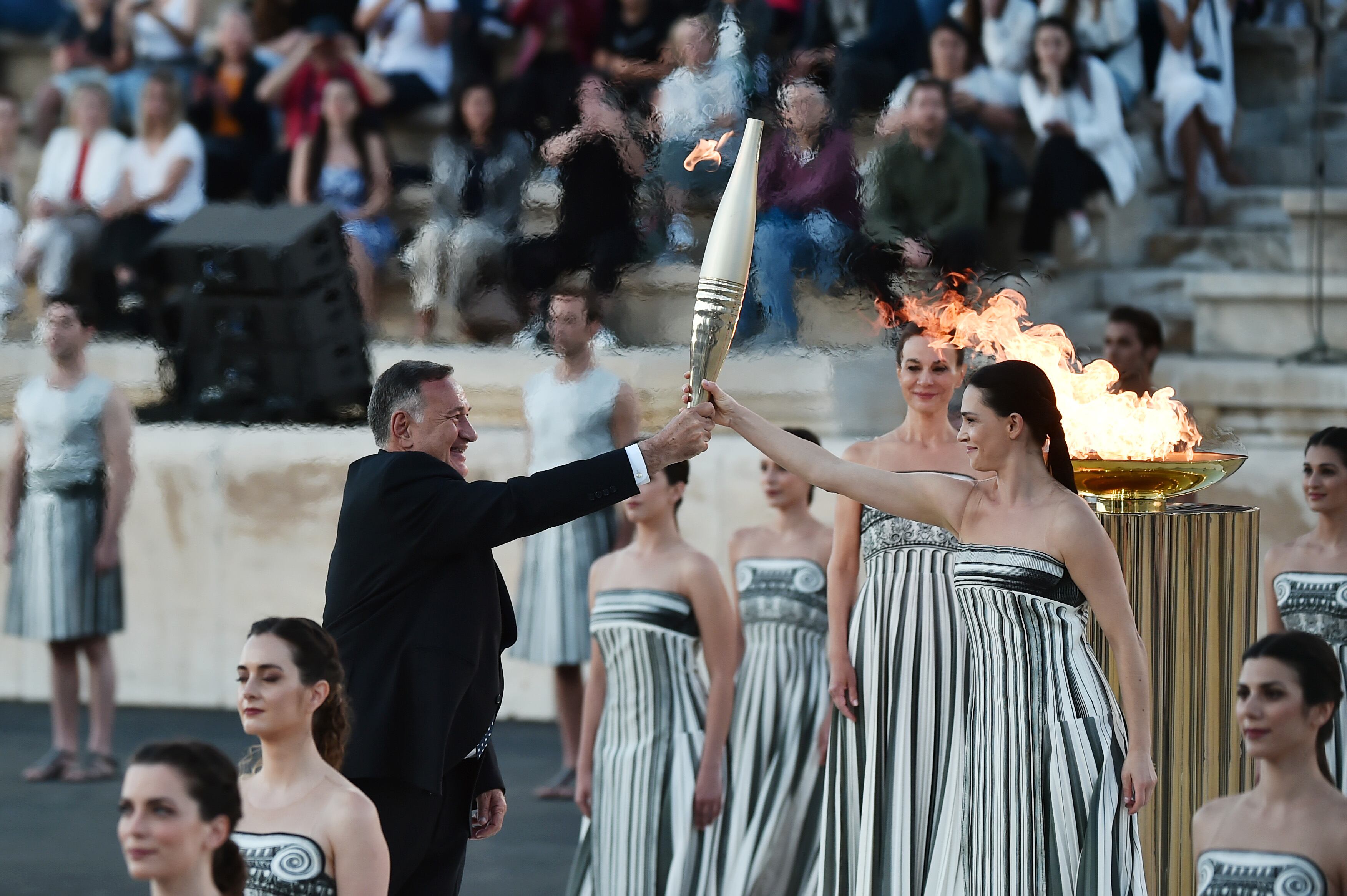 Posterior a los honores, la parte histórica tomó su lugar con las ‘sacerdotisas’ presenciando los últimos relevos griegos protagonizados por diversos medallistas helénicos que llevaron el fuego hasta un pequeño pebetero ubicado en El Centro del Estadio Panatenaico, dando paso a una nueva danza.