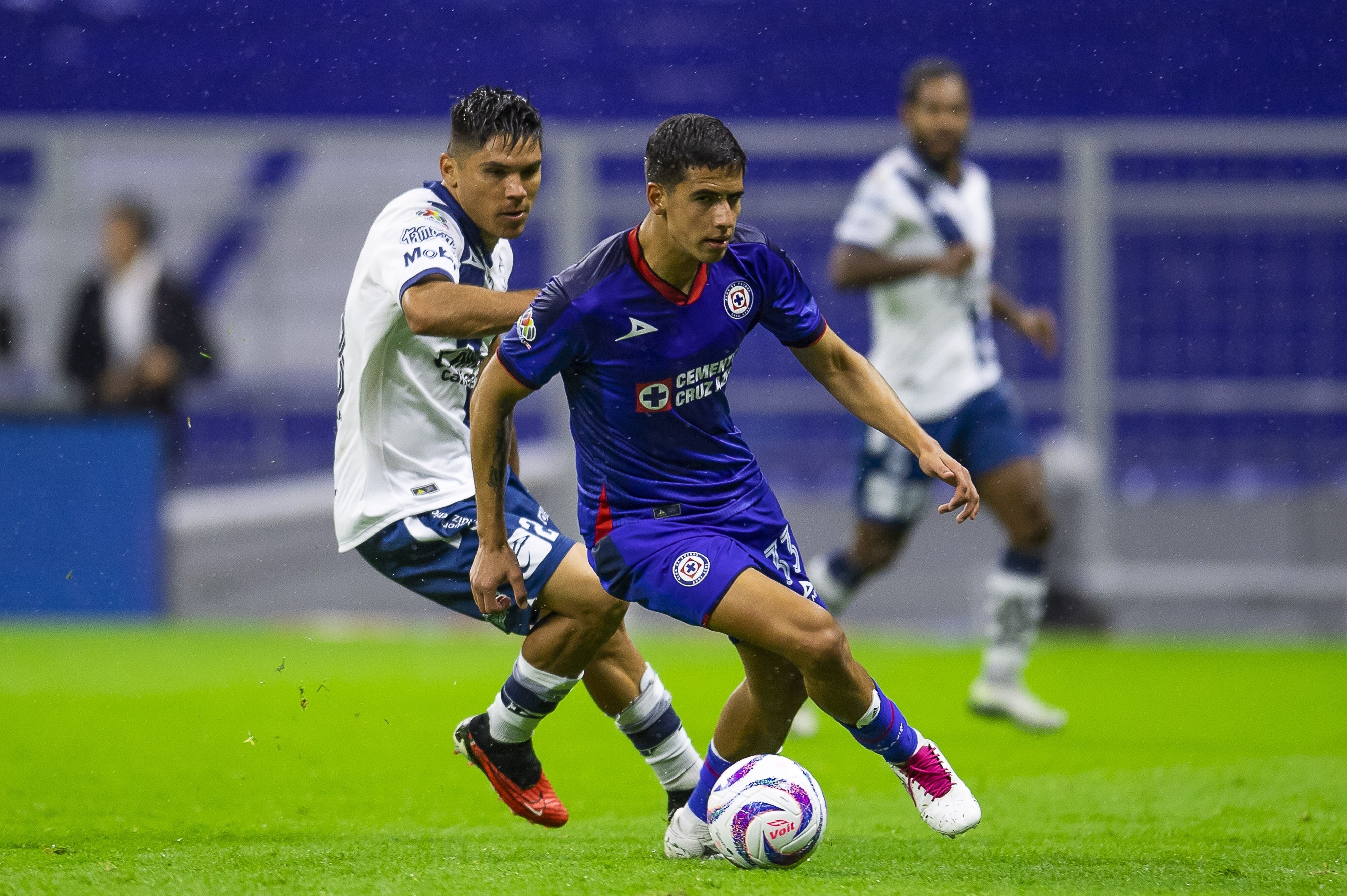 (I-D), Martin Barragan de Puebla y Rafael Guerrero de Cruz Azul durante el partido Cruz Azul vs Puebla, correspondiente a la Jornada 17 del Torneo Apertura 2023 de la Liga BBVA MX, en el Estadio Azteca, el 12 de Noviembre de 2023 (Juan Luis Diaz/Juan Luis Diaz)