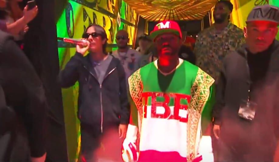 Por su parte, el Money hizo su trabajo al salir con los colores de la bandera nacional en una capa y una gorra roja con las letras TMT en verde, blanco y rojo. Asimismo, podemos destacar que en los guantes del expugilista, el color blanco dominaba sobre los detalles en rojo y verde, lo que lo hizo conectar muy bien con el público.