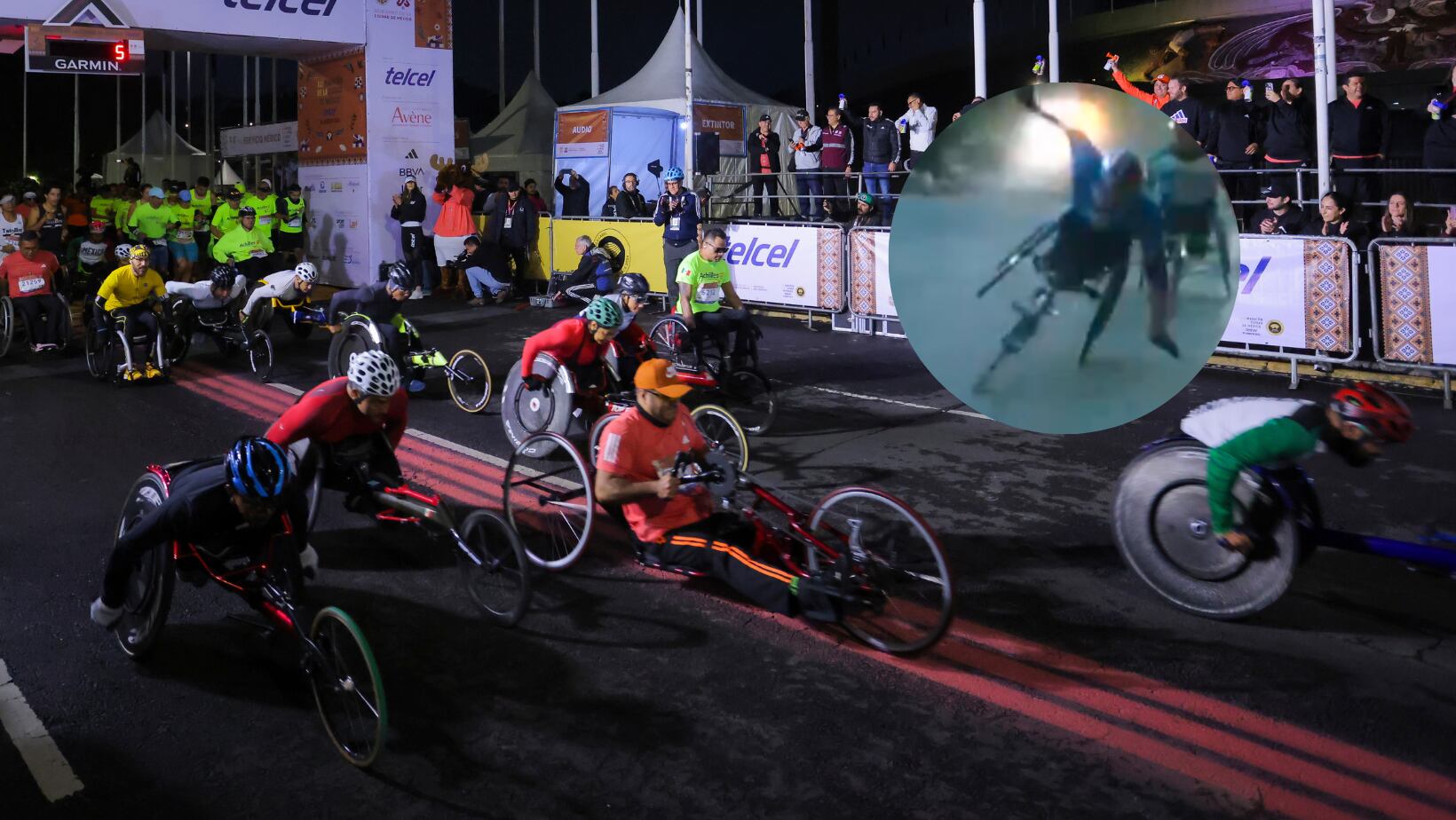 El incidente ocurrió en la categoría de silla de ruedas y débiles visuales, a la altura del kilómetro 11, cerca de la glorieta de Insurgentes, donde el atleta se encontró con una alcantarilla más profunda de lo habitual.
