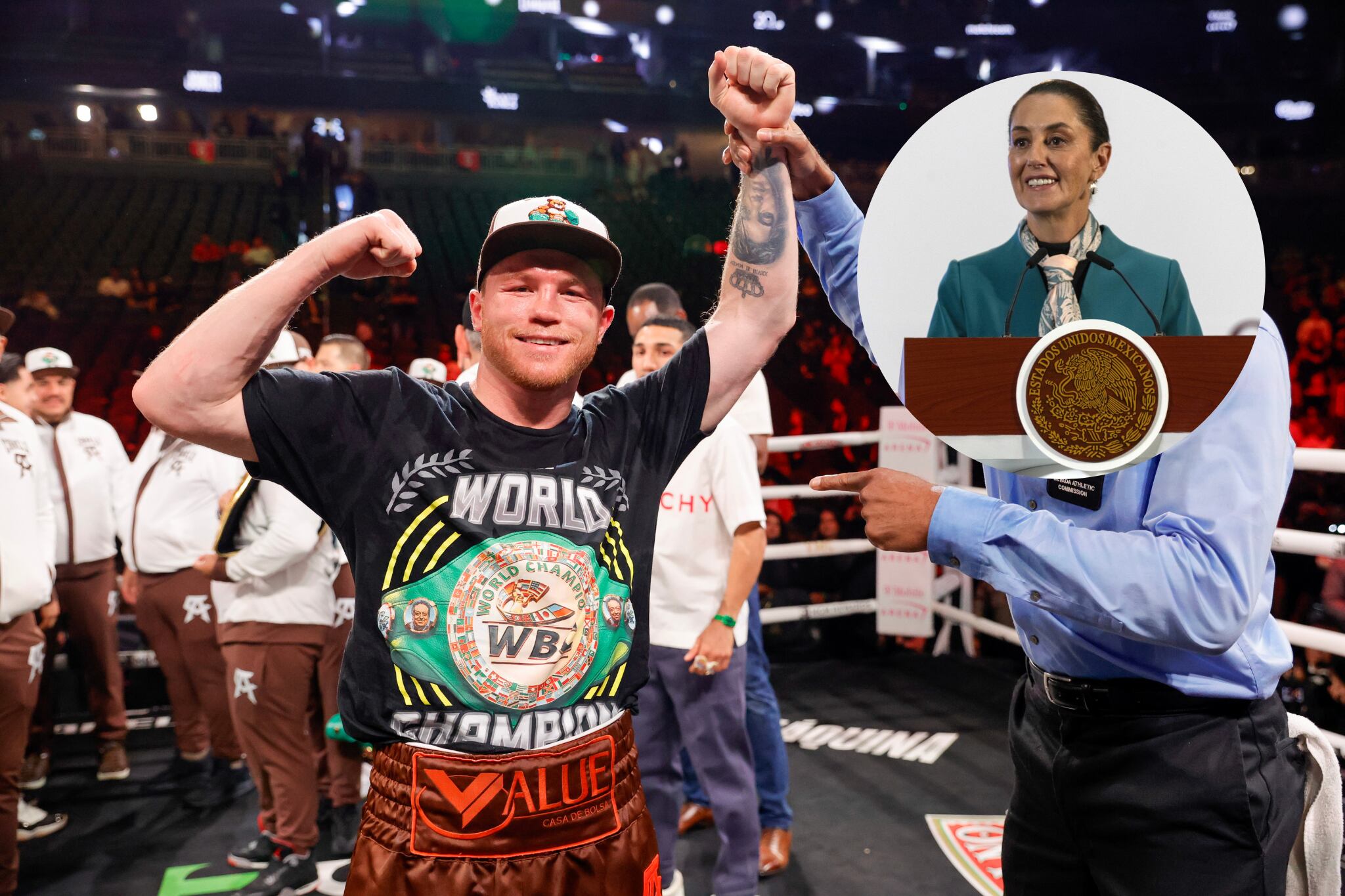 Es importante recalcar que el presidente del CMB, Mauricio Sulaimán, tambien acudió a la conferencia, comentando sobre lo importante que fue la clase masiva en el Zócalo hace algunos años, rompiéndose Récord Guinness en esa ocasión. Momentos después el presidente del CMB le dio un detalle a Claudia Sheinbaum, obsequio que llamó, “Los guantes blancos de la paz”, y dándole crédito a Saúl Álvarez por ser un ejemplo a seguir.