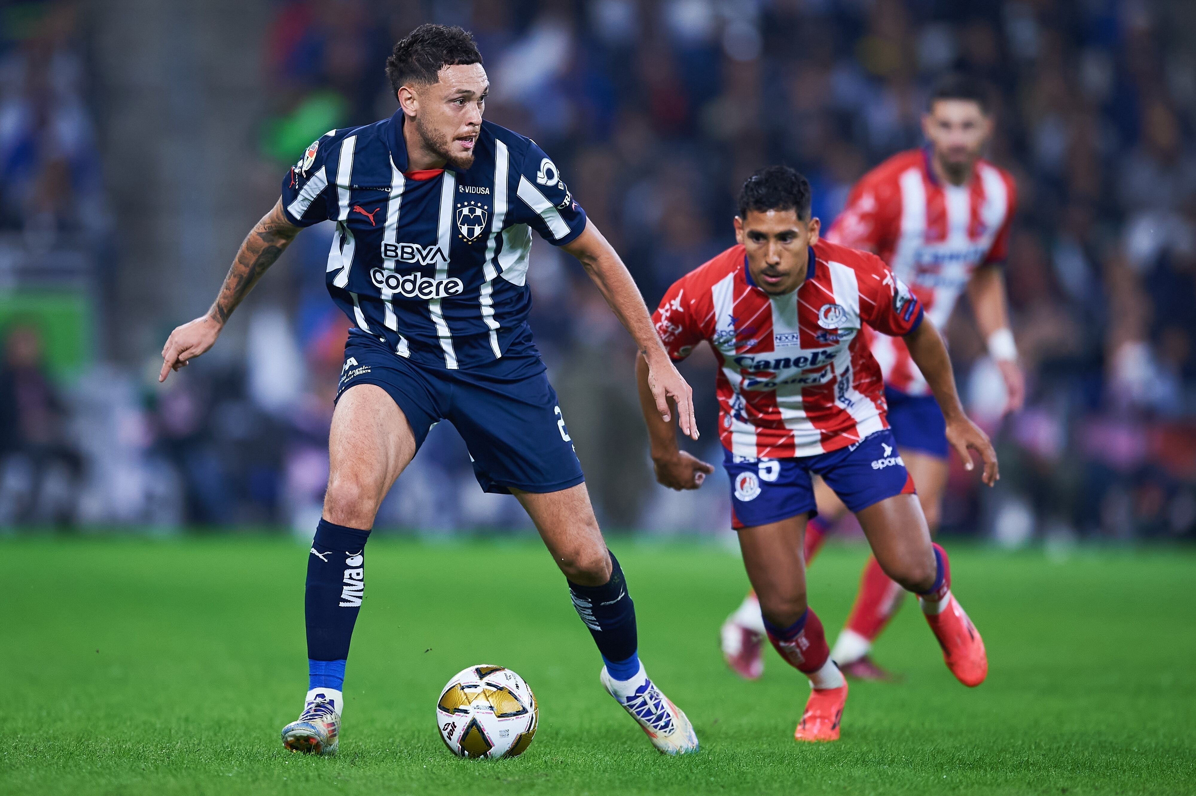 Monterrey vs Atletico de San Luis Lucas Ocampos (L) of Monterrey fights for the ball with Ricardo Chavez (R) of San Luis during the Semifinal second leg match between Monterrey and Atletico de San Luisas part of the Liga BBVA MX, Torneo Apertura 2024 at BBVA Bancomer Stadium on December 07, 2024 in Monterrey, Nuevo Leon, Mexico. (Jorge Martinez/Jorge Martinez)
