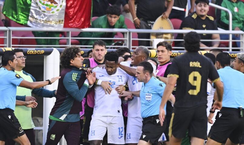 Con solo 10 minutos de partido, la tensión llegó hasta la cancha del Levi’s Stadium, justo cuando un balón salió del terreno de juego y llegó hasta la banca azteca, provocando un encuentro cara a cara de un futbolista hondureño con todos los suplentes del cuadro nacional.