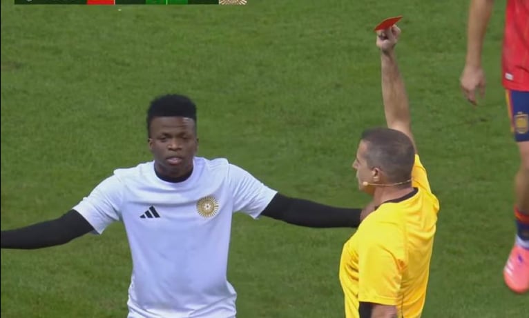 La jugada incluso se revisó en el VAR y fue el silbante Cristóbal Soria el que lo mando a las regaderas. Este hecho también generó risas entre los presentes, ya que el juez es parte del famoso programa ‘El Chiringuito’, donde suele tener opiniones en contra de las actitudes de Vinícius Jr, jugador del Real Madrid.