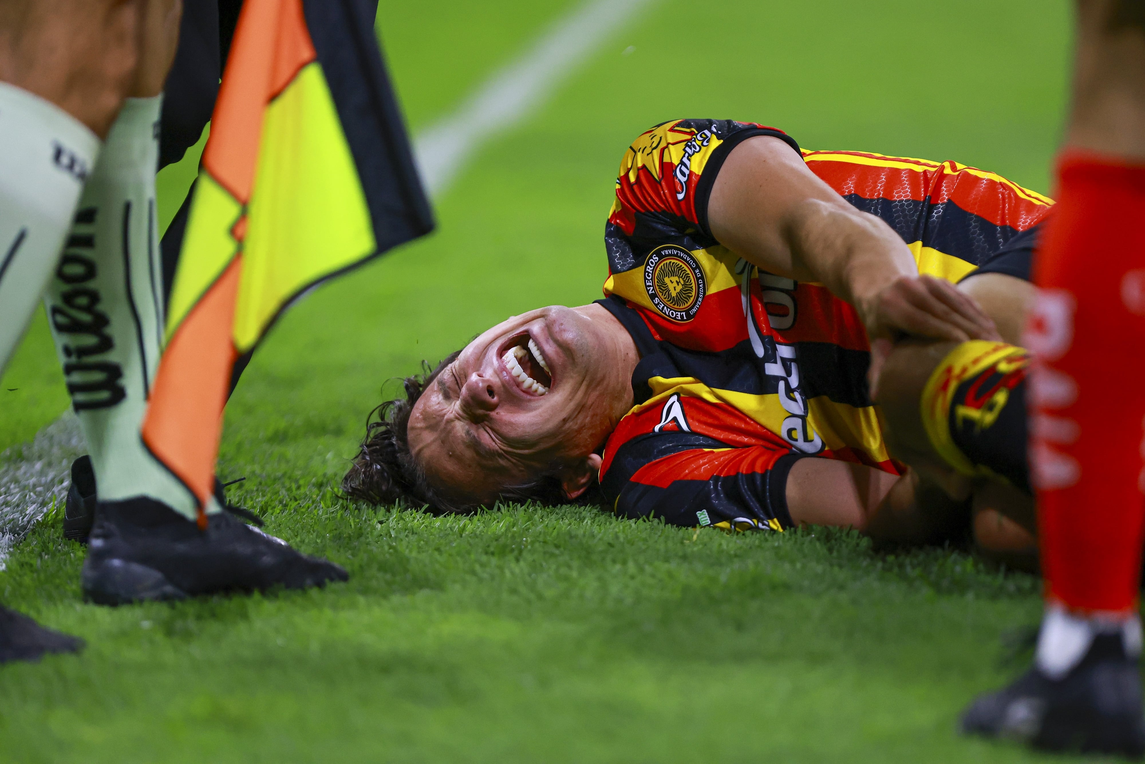 Corría el segundo tiempo del encuentro cuando el delantero mexicano disputó un balón dividido; en la acción, su rodilla izquierda se atoró en el césped, provocando una caída brusca y antinatural.