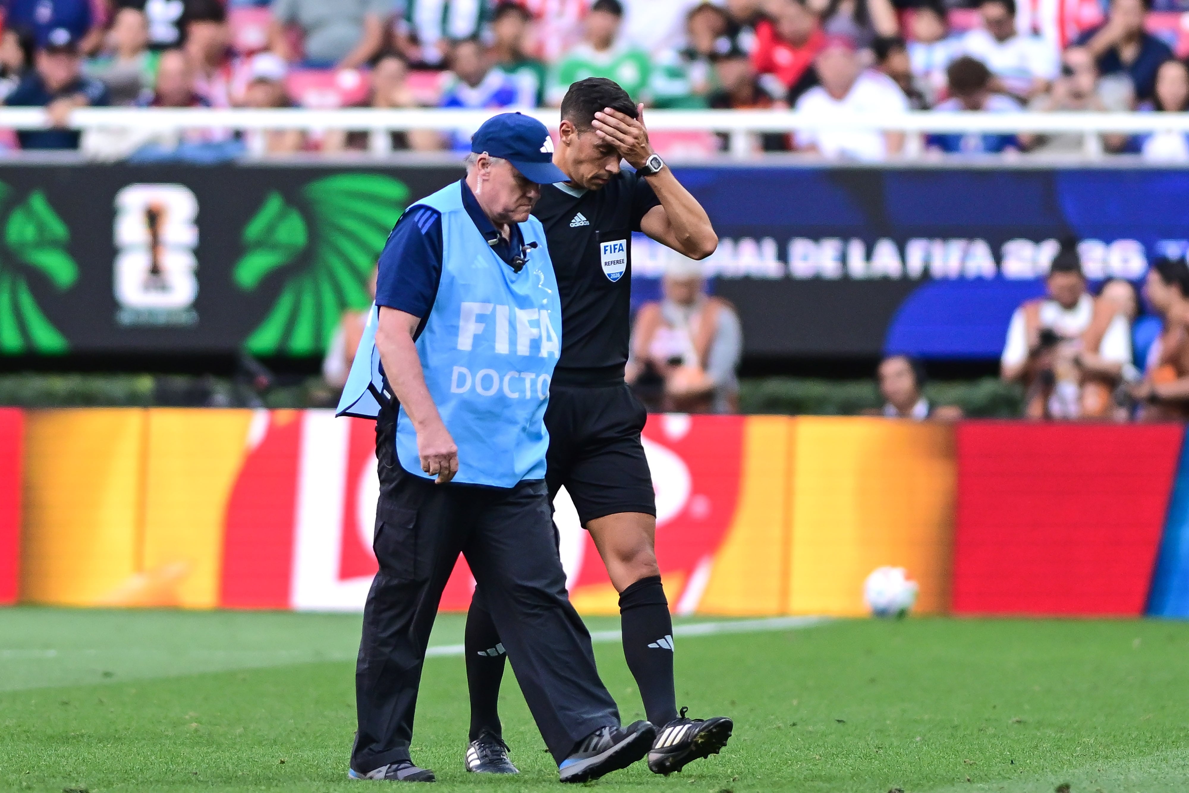 Segundos después, la situación se agravó: el colegiado se recostó sobre el césped evidenciando un fuerte calambre. De inmediato, el cuerpo médico de la FIFA ingresó al campo para brindarle atención, mientras el partido quedaba momentáneamente detenido.