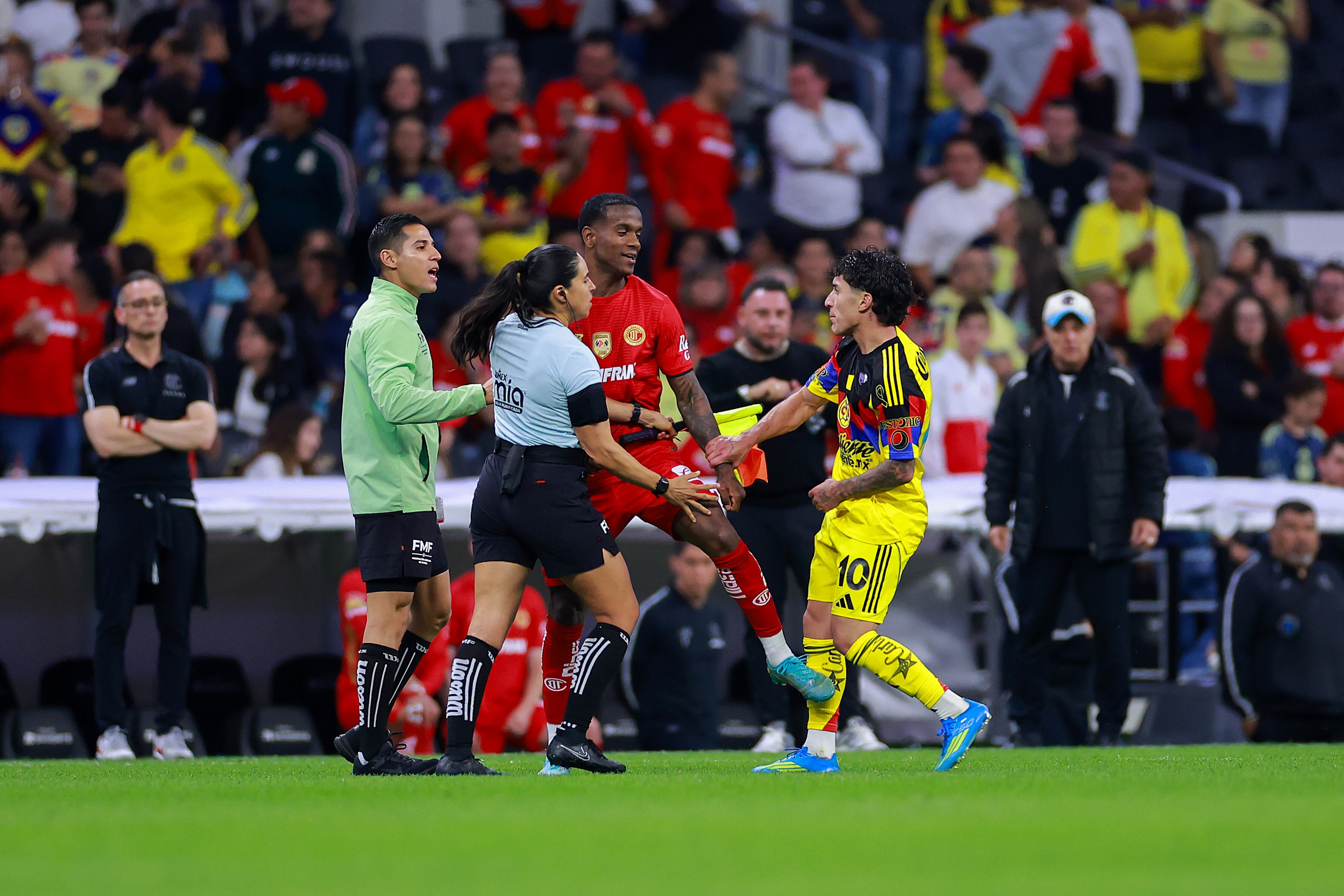 El incidente se originó luego de la expulsión de Helinho, lo que provocó un conato de bronca dentro del terreno de juego. En medio del caos, la jueza de línea intervino físicamente para contener a Zendejas, una acción que no fue bien vista por Mohamed.