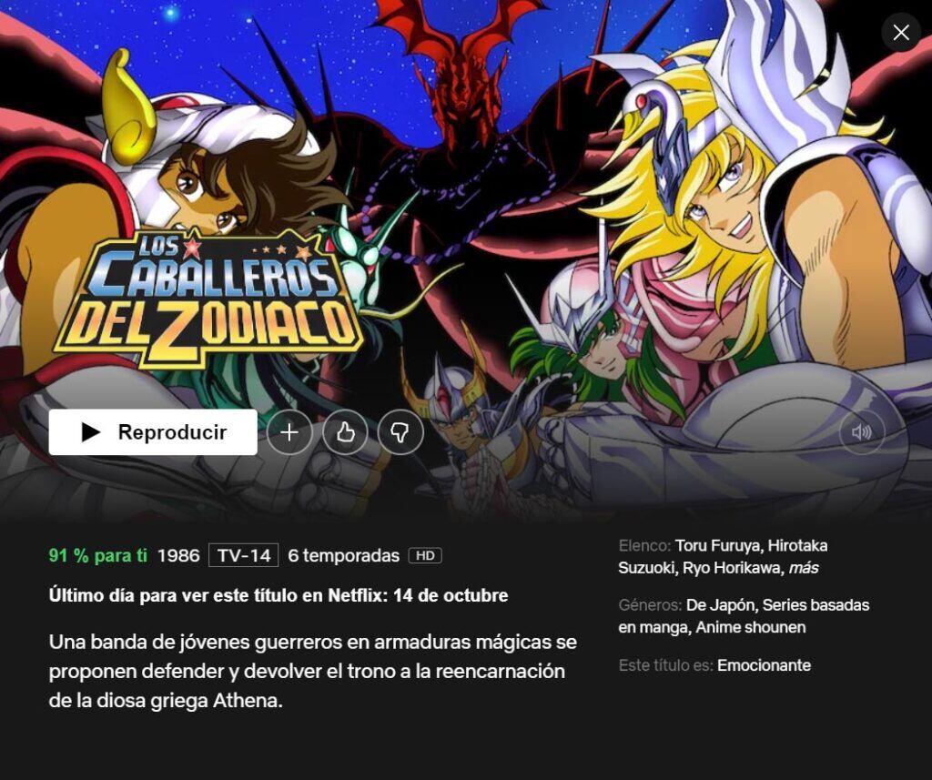 Sorprendente pero cierto: Netflix desechará de Saint Seiya, una de las series más míticas de la televisión. Los Caballeros del Zodíaco ha sido uno de los animes más amados por aquellos que crecieron durante las décadas de los 80s y 90s. Muchas de estas personas se alegraron cuando la adaptación de la obra de Masami Kurumada llegó a Netflix hace un par de años. Sin embargo, si aún no has visto este clásico, será mejor que lo hagas inmediatamente, ya que Los Caballeros del Zodíaco abandonarán esta plataforma de streaming el 14 de octubre de 2021.