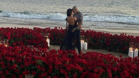 Tras siete meses de noviazgo, el músico entregó a la socialité un costoso anillo de compromiso en una ceremonia romántica frente al mar en Montecito, California, uno de los lugares favoritos de la pareja. Las rosas rojas y las velas blancas destacaron en el evento en el que asistieron sus amistades y parte del clan Kardashian.