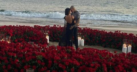 Tras siete meses de noviazgo, el músico entregó a la socialité un costoso anillo de compromiso en una ceremonia romántica frente al mar en Montecito, California, uno de los lugares favoritos de la pareja. Las rosas rojas y las velas blancas destacaron en el evento en el que asistieron sus amistades y parte del clan Kardashian.