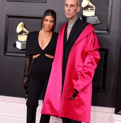 Kourtney y Travis, quienes se comprometieron a finales de 2021, destacaron con sus atuendos. coordinados La empresaria se vistió con mono negro con escote en V, mangas transparentes y cortes simétricos, mientras que el músico optó por un blazer negro sin mangas, pantalones combinados y una capa de seda rosa que usaba a ratos.