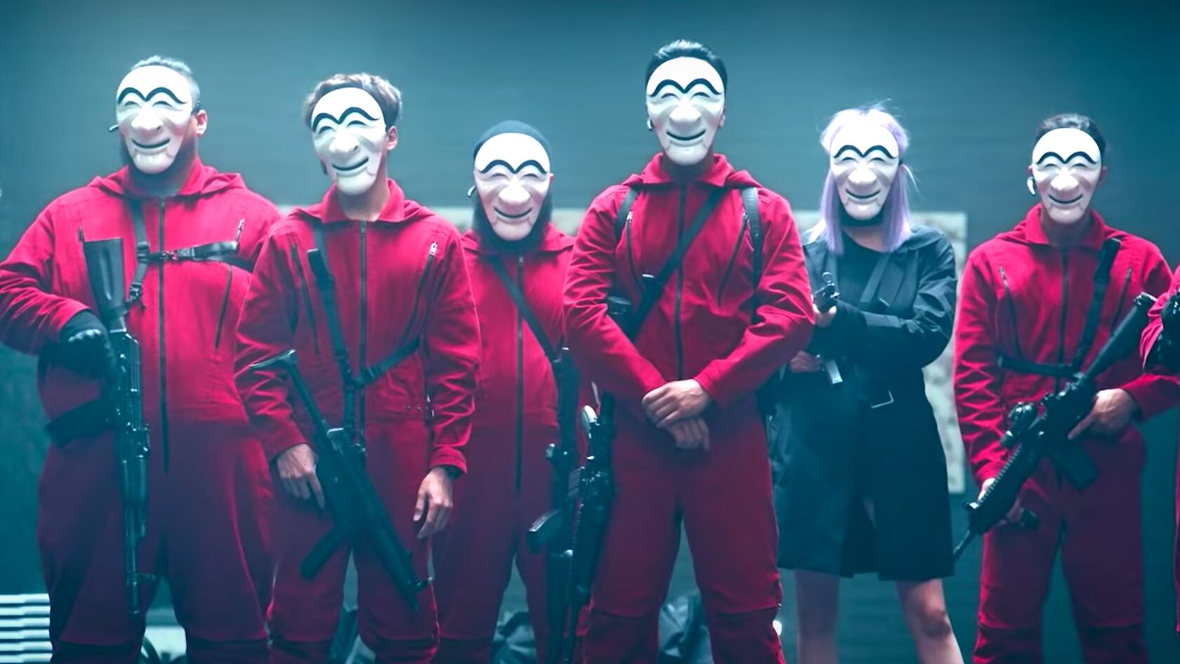 Asimismo, en el video se puede observar al equipo de atracadores junto y todos están vestidos con el mono rojo y con una máscara blanca. Relacionado con los personajes en esta imagen tomada de las redes sociales se muestra el equivalente a los actores de “La Casa de Papel” de la versión española. El elenco está conformado de la siguiente manera: Park Hae-soo es “Berlín”, Jeon Jong-seo es “Tokyo”, Yoo Ji-tae es “El Profesor”, Lee Hyun-woo es “Río” y Kim Ji-hoon es “Helsinki”.