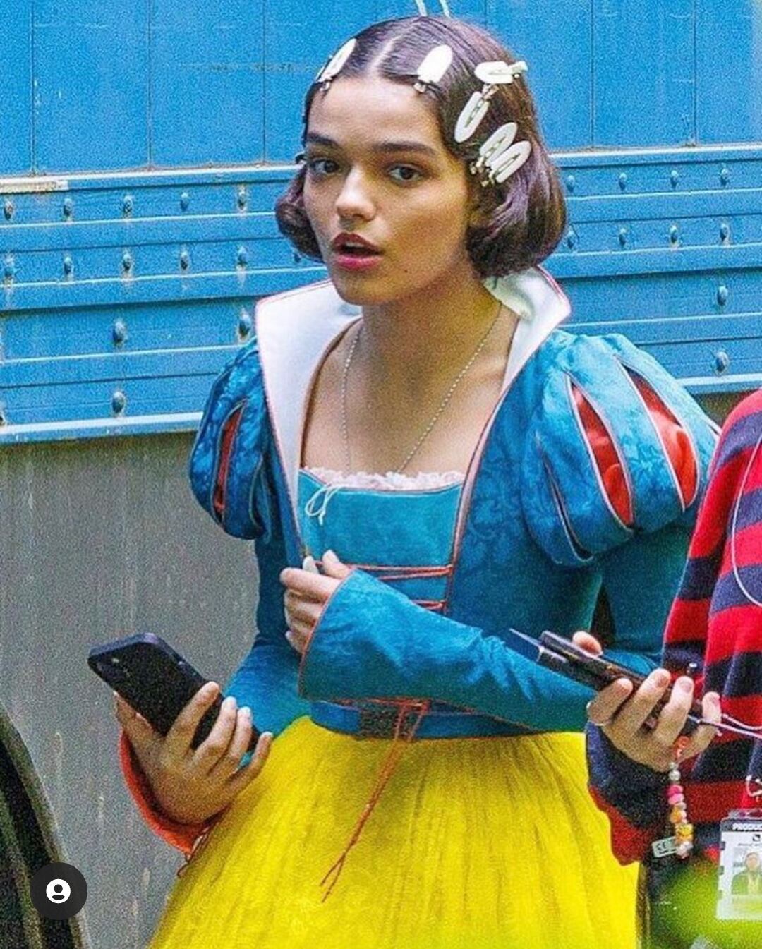En las fotografías se ve a Rachel vestida del tradicional traje; corpiño azul, acompañada de una falda de tul amarillo intenso, con broches en el cabello para reafirmar su peinado y con unas botas, lo que podría significar que ésta no es la caracterización final de su personaje, sino una parte del mismo.