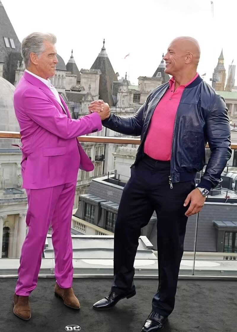 Daily Mail publica un set fotográfico de ambos actores en Londres, que se preparan para estrenar la cinta de DC Comics en los próximos días. Dwayne Johnson interpreta al personaje principal, pero el look de Brosnan se llevó todos los focos de atención.