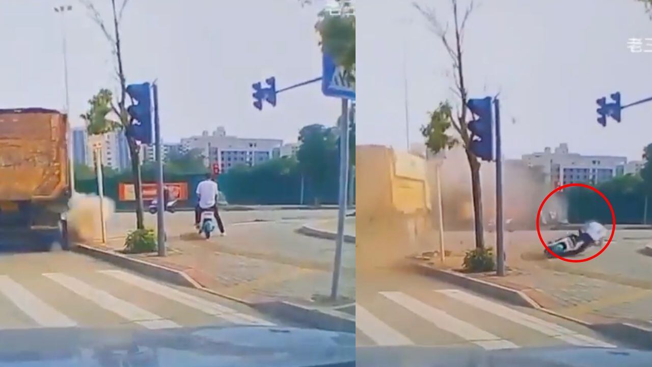 Un camión de carga pesada pasó a lado del joven para dar vuelta. El mal cálculo provocó que una de las llantas subiera a la acera, mas por el gran peso, esta se rompió y provocó una “explosión” de tabiques. El motociclista fue alcanzado por los residuos, al no tener casco, uno de los objetos lo golpeó en la cara.