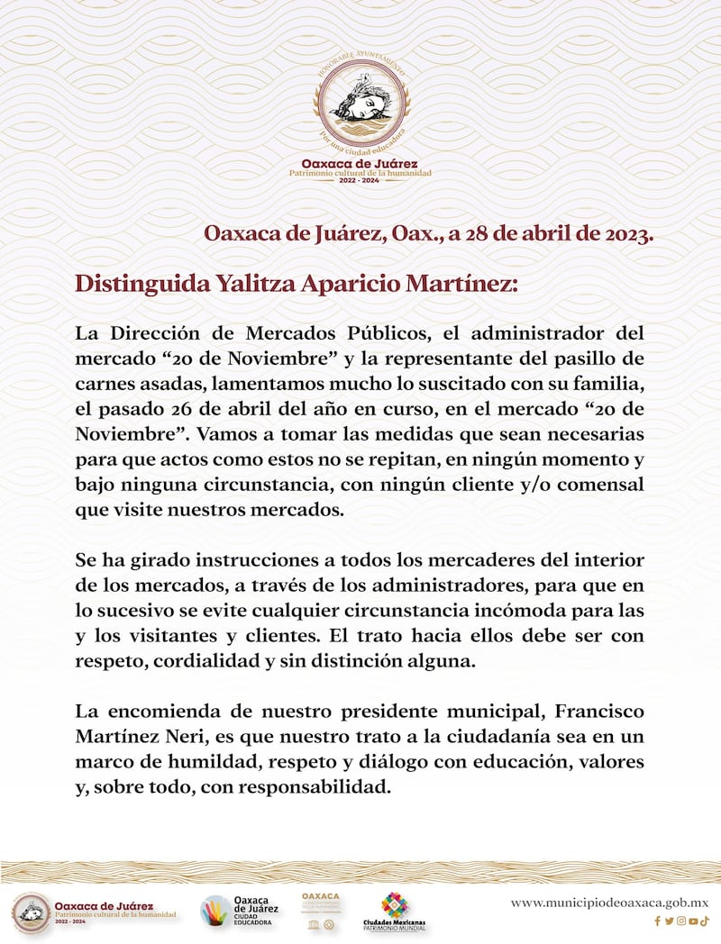 “Lamentamos mucho lo suscitado con su familia, el pasado 26 de abril del año en curso, en el mercado 20 de noviembre. Vamos a tomar las medidas que sean necesarias para que actos como éste no se repitan”, dicta el comunicado que se publicó recientemente.