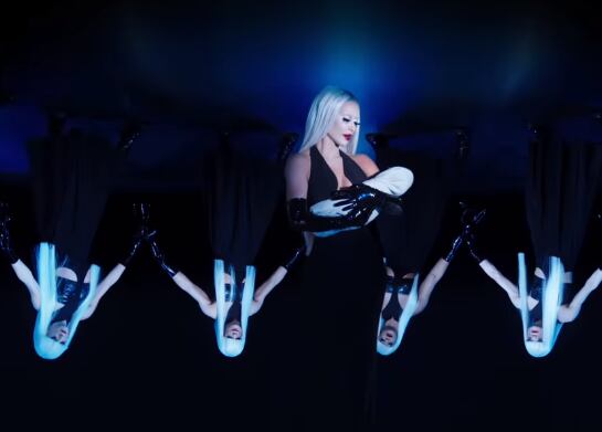 La dueña de Skims, de 42 años, tenía una peluca blanca, un vestido negro largo y a un bebé en brazos mientras suena “Rock-A-Bye Baby” de fondo.