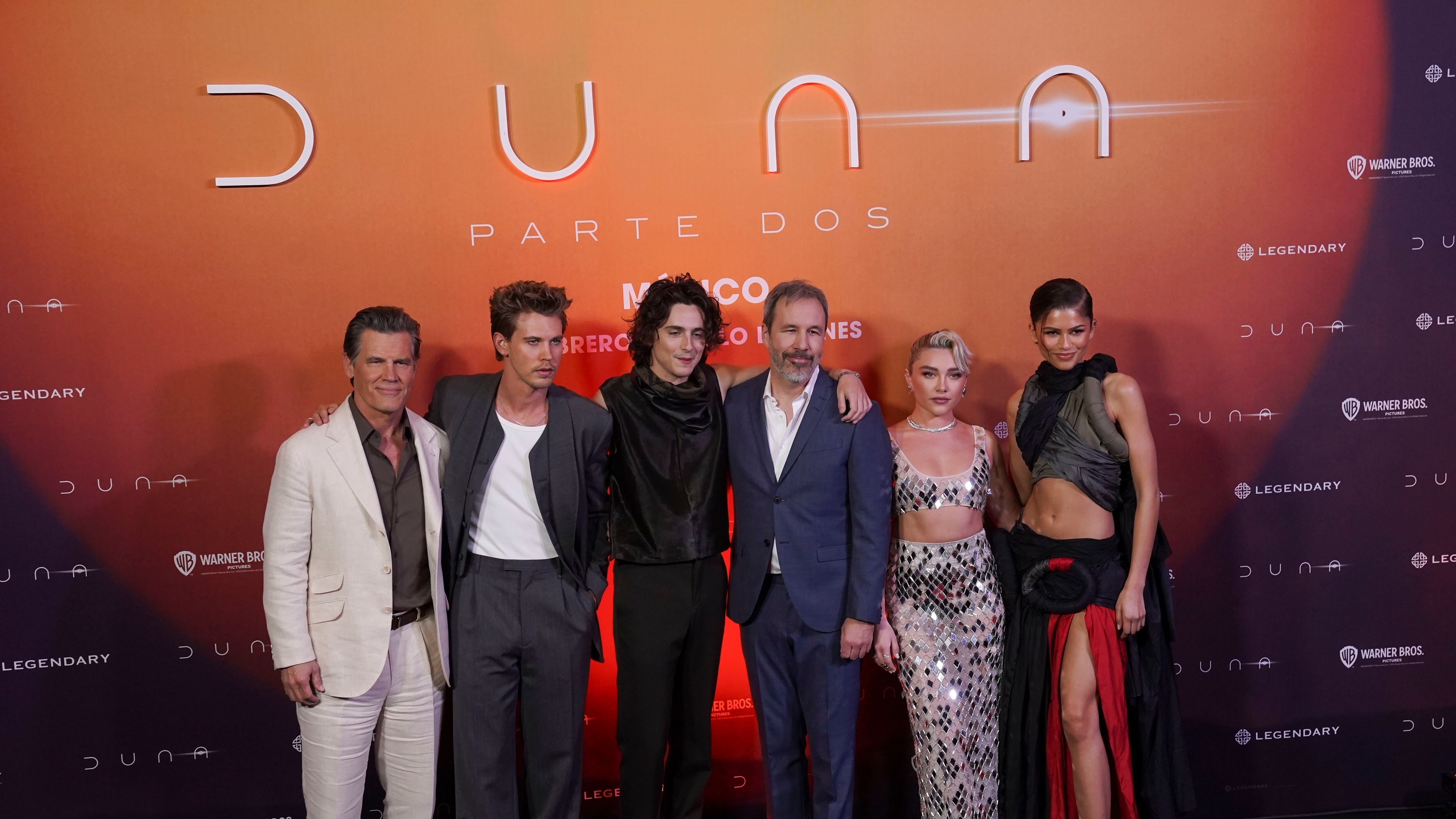 Los actores Josh Brolin, de izquierda a derecha, Austin Butler, Timothee Chalamet, Florence Pugh y Zendaya posan con el director Denis Villeneuve, centro, en una sesión fotográfica para promover la película "Dune: Part Two" en la Ciudad de México el l AP (Marco Ugarte/AP)