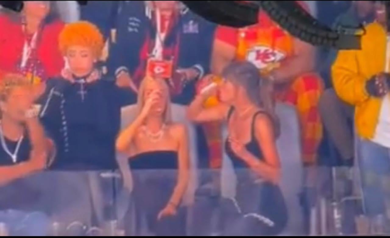 Antes de que comenzará el show de medio tiempo, Taylor fue captada por la cámara del estadio, demostrando que le gusta enfiestarse.