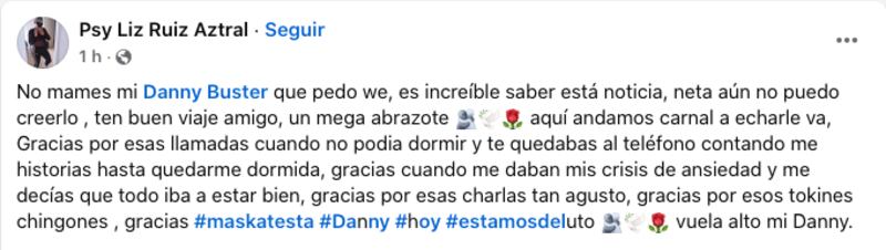 “Dale duro y dale fuerte que siempre suene esa distor, ese riff con tu guitarra en todos los corazones de los que te conocimos; de los que te amamos, de los que te extrañaremos, de los que te conocerán por este legado que dejas en la música. ¡El ska está de luto! ¡Danny Buster vuela alto! SOMOS PANKS”.