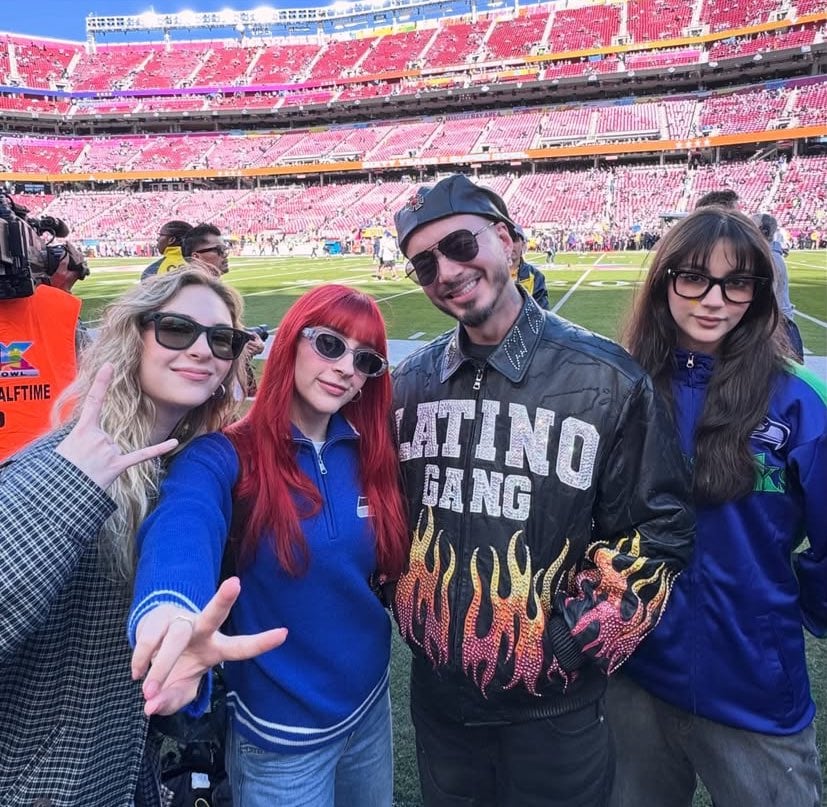 J Balvin lució una chamarra de “Latino Gang” en el Super Bowl , donde se han difundido más imágenes de J Balvin en el campo.