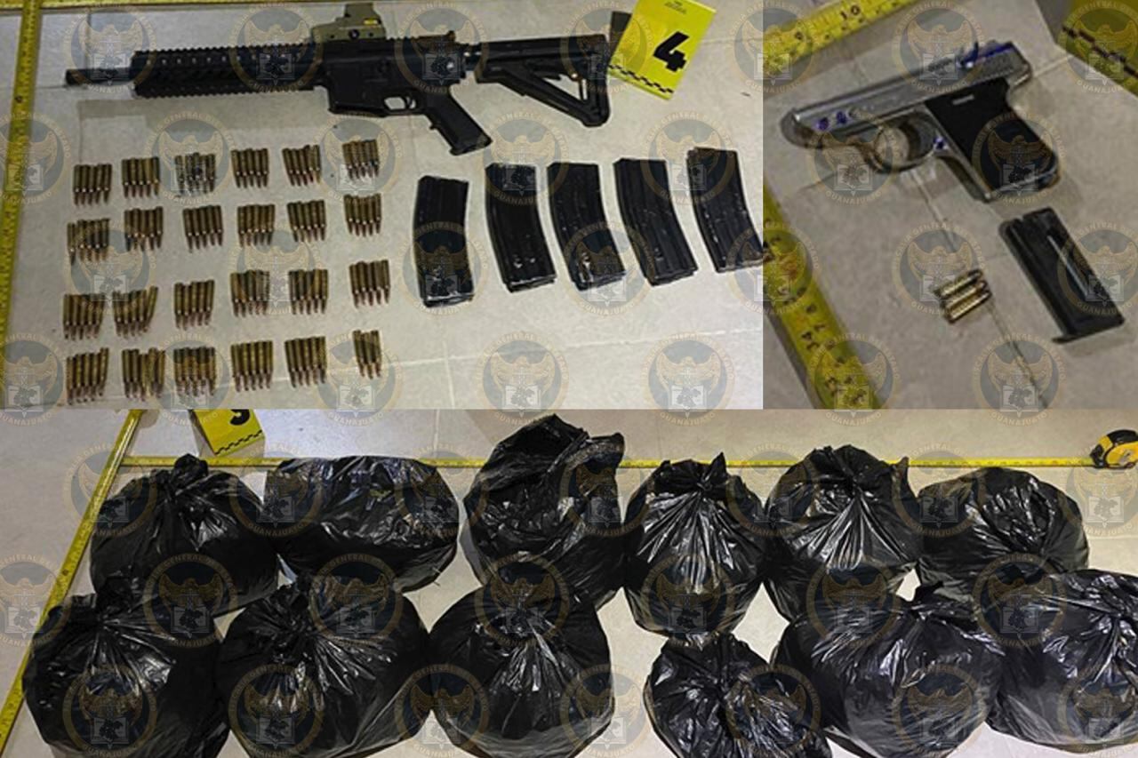 Mediante este operativo se pudo detener a los cuatro primeros, y en un cateo a varios inmuebles ubicados en San Miguel de Allende, en los cuales se encontró y aseguró droga, armas, equipo táctico, celulares, cargadores, cartuchos, credenciales, mochilas, entre otros indicios relacionados con un grupo criminal, se detuvo a dos mujeres más.