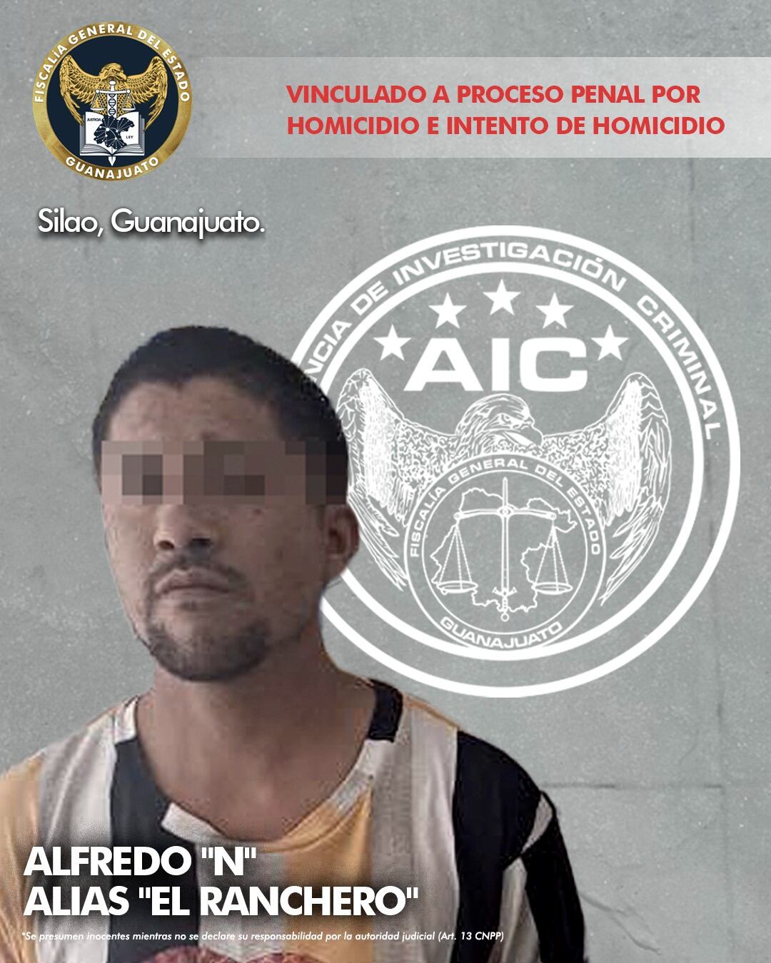 Alfredo N alias “El Ranchero” fue detenido por Agentes de Investigación Criminal y vinculado a proceso penal, acusado de disparar contra un grupo de hombres en la colonia Guadalupe en Silao, donde uno de ellos falleció y cuatro más sobrevivieron al escabullirse entre los vehículos estacionados.
