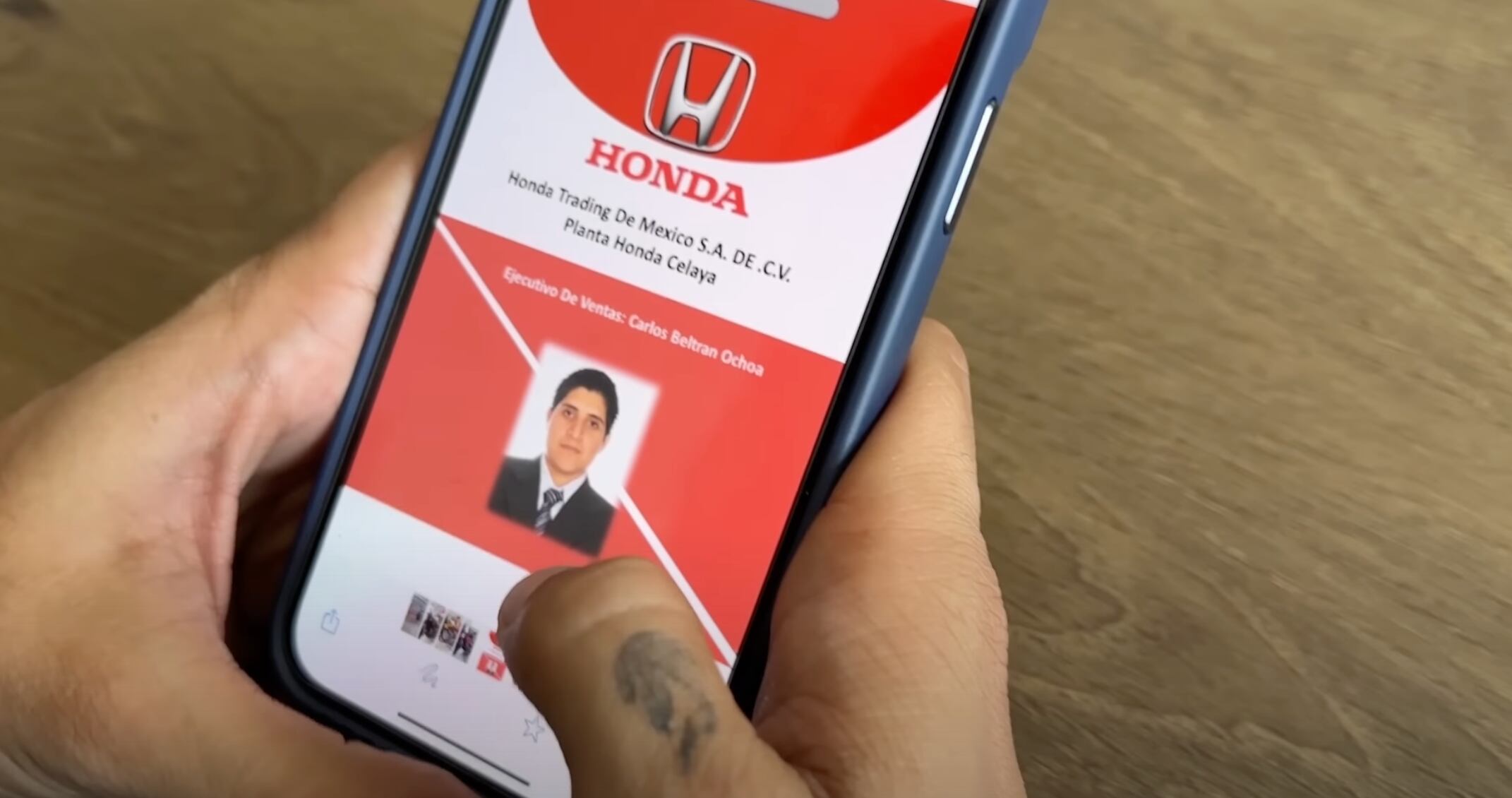 Por medio de whatsapp los vendedores envían una imagen de lo que sería su credencial de trabajador de la planta en Honda Celaya. Esta identificación está a nombre de Carlos Beltrán Ochoa y se acredita como ejecutivo de ventas en la planta Honda Celaya.