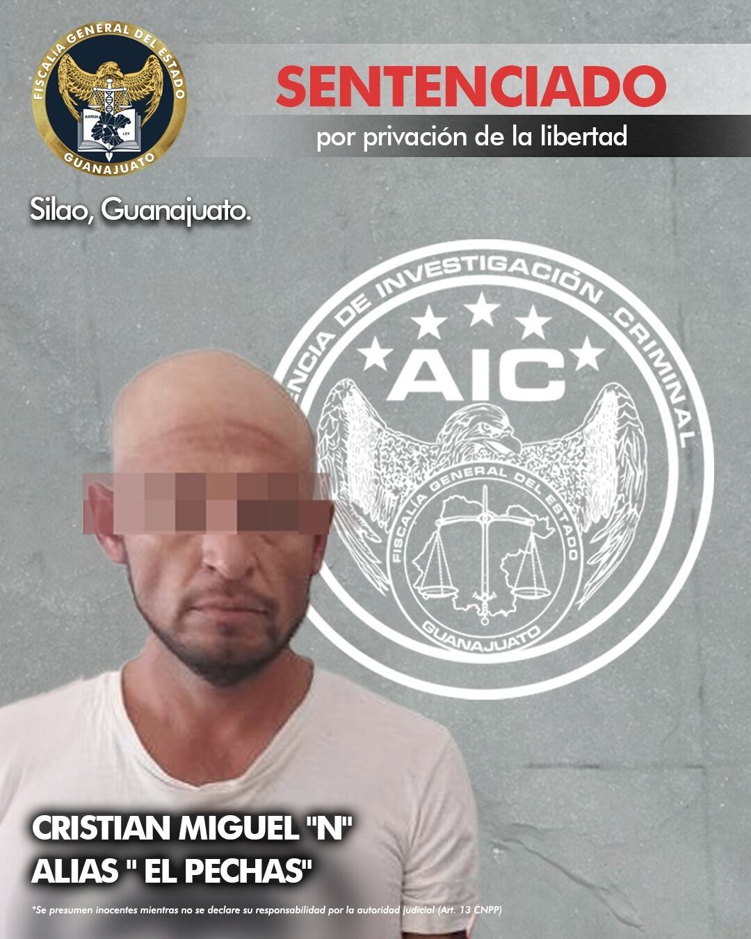 La Fiscalía de Guanajuato informó sobre la sentencia de 5 años contra Cristian Miguel, alias “El Pechas” luego de ser encontrado culpable del delito de privación de la libertad a un adolescente cuyo cuerpo fue localizado sin vida, en un baldío en la comunidad de Beta de Franco del municipio de Silao, “El Pechas” estaba detenido desde 2021, con lo que ya cumplió más de la mitad de su sentencia en la cárcel.