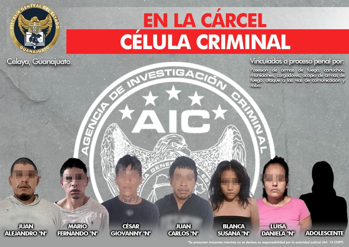 Derivado de los trabajos de investigación llevados a cabo por los crímenes perpetrados recientemente en la ciudad de Celaya, la Agencia de Investigación Criminal obtuvo información y logró ubicar un inmueble donde se detectó la probable comisión de actividades ilícitas, por lo que, se ejecutó una orden de cateo que permitió a los Agentes de Investigación Criminal ingresar y detener a Juan Alejandro, Mario Fernando, César Giovanny, Juan Carlos, Blanca Susana, Luisa Daniela y a una menor de edad.