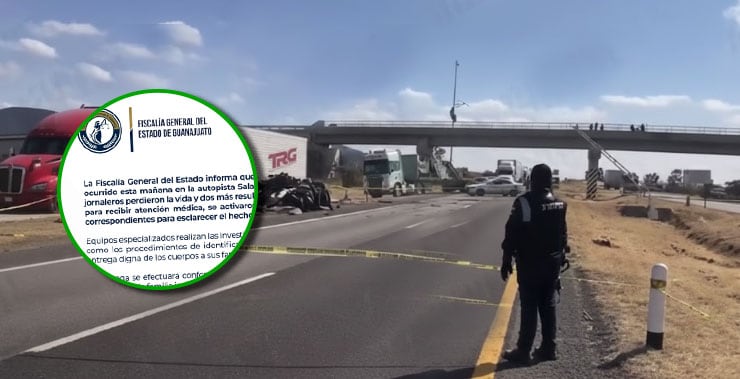 La Fiscalía del Estado informó que tras el choque registrado en la autopista Salamanca–León, en dirección a esta ciudad, nueve jornaleros perdieron la vida y dos más fueron trasladados a hospitales para recibir atención médica. Debido a la magnitud del hecho, la institución activó de inmediato los protocolos correspondientes para el esclarecimiento del accidente.