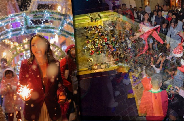 La noche del sábado, la posada en el centro histórico de Guanajuato capital tuvo un giro inesperado: nevó. No fue un frente frío, sino una nevada artificial que cayó sobre arcos de luz, fachadas iluminadas y un gentío que se detuvo a mirar el cielo como si se hubiera abierto una postal.