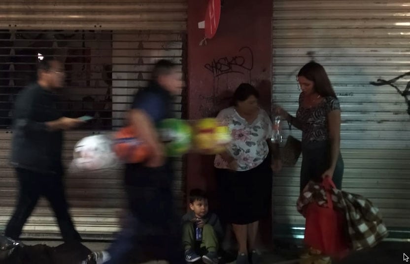 A su lado, dos mujeres sostienen la escena como se sostienen los días complicados: con manos ocupadas. Una revisa algo —una bolsa, un vaso, un papel— y la otra carga más de lo que cabe en una sola mano: ropa, cobija, quizá el abrigo del niño o la vida entera doblada en cuadros. No discuten fuerte, no posan. Solo están ahí, en modo resistencia, cuidando que el pequeño no se pierda entre tanto paso.