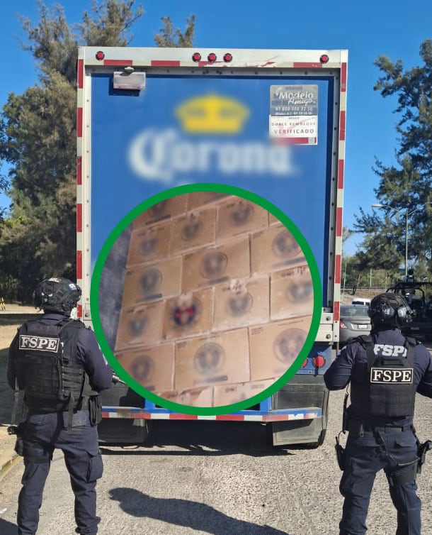 Durante la inspección del remolque asegurado por la FSPE, se localizó mercancía consistente en mil 100 cajas de cerveza, cada una con 12 botellas de 940 mililitros, cuyo valor comercial estimado asciende a 440 mil pesos, de acuerdo con datos oficiales.