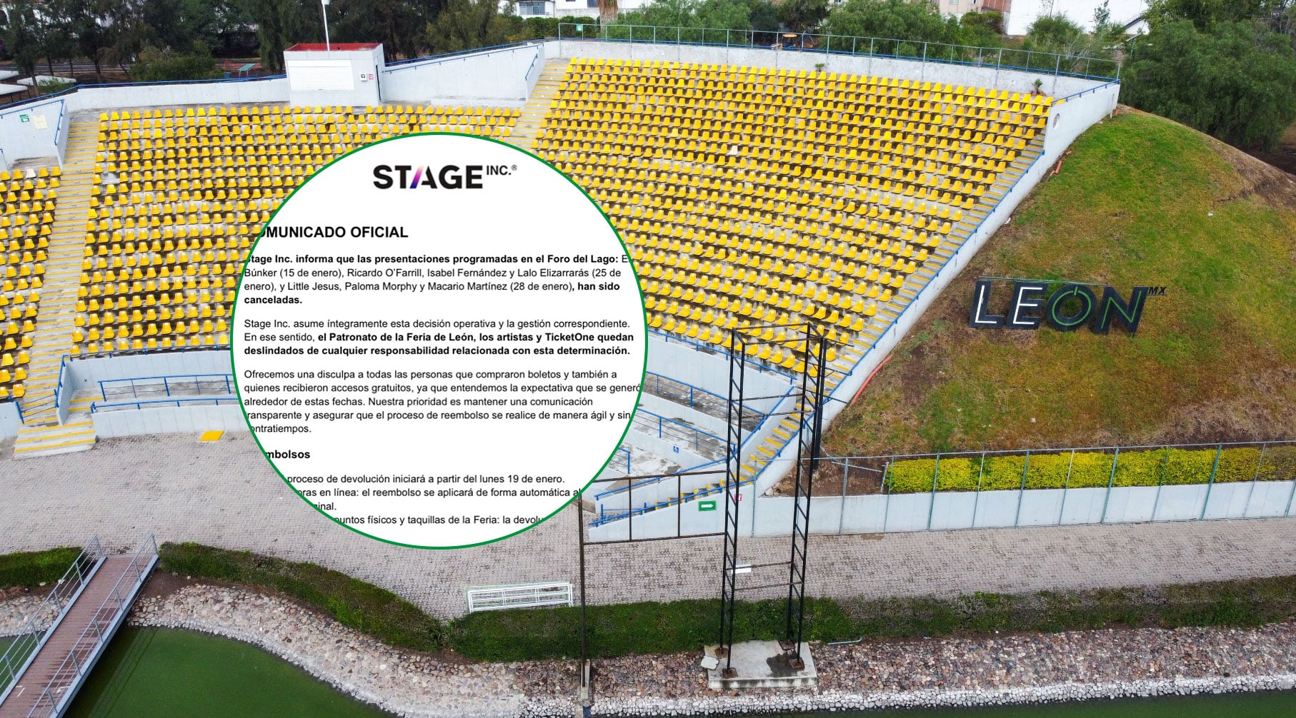 Stage Inc. anunció la cancelación de la cartelera de espectáculos programados en el Foro del Lago de la Feria Estatal de León 2026, que incluía presentaciones de El Búnker, Ricardo O’Farrill, Isabel Fernández y Lalo Elizarrarás (25 de enero), así como Little Jesus, Paloma Morphy y Macario Martínez (28 de enero).