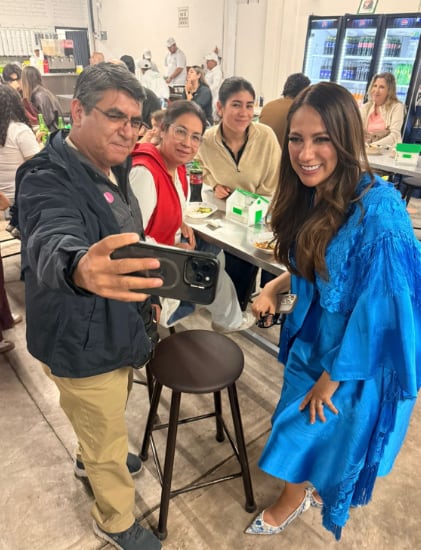Durante la visita, varios clientes se acercaron a saludarla y a pedirle fotografías. La escena se desarrolló en un ambiente relajado entre mesas, platos de tacos y refrescos.